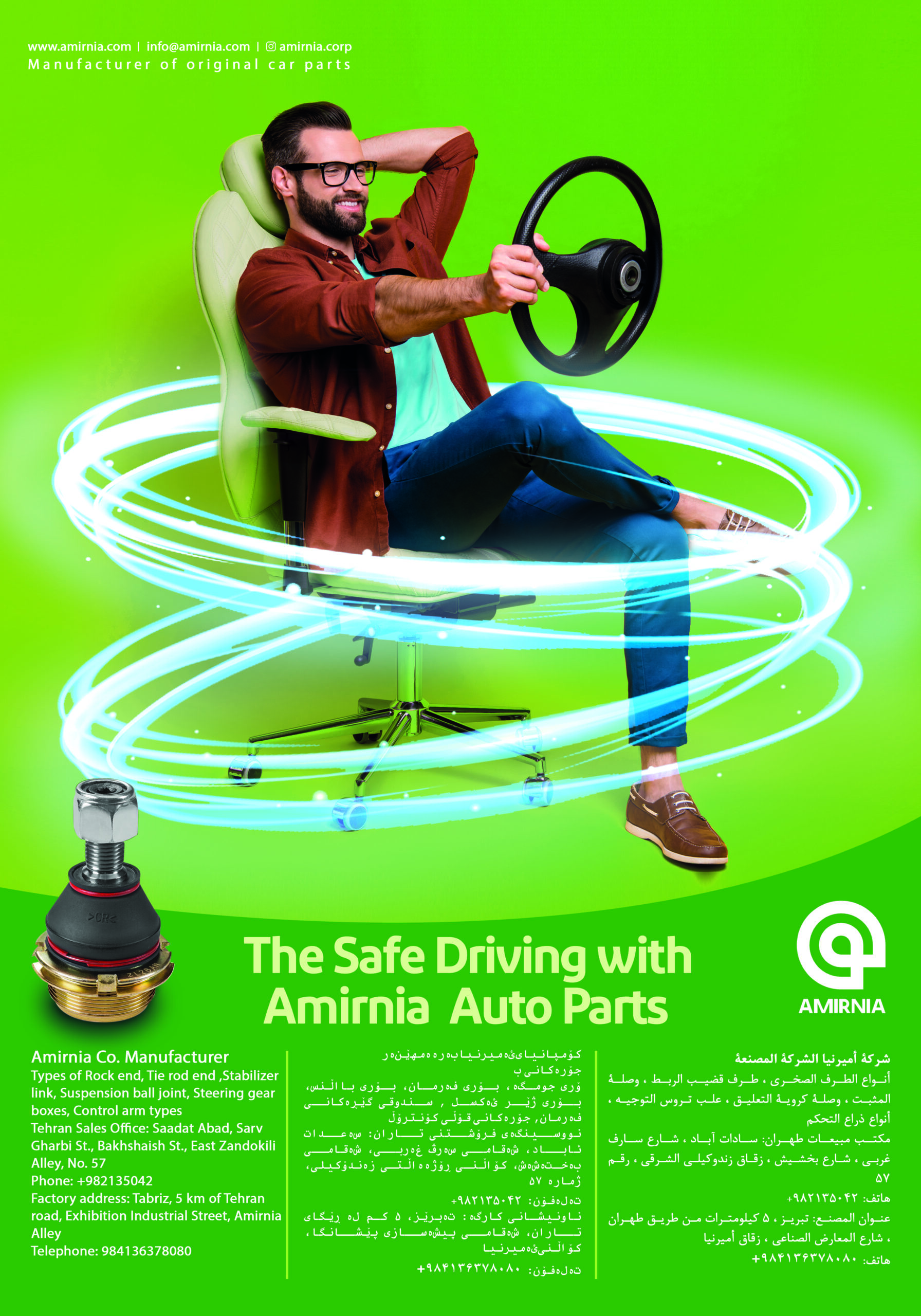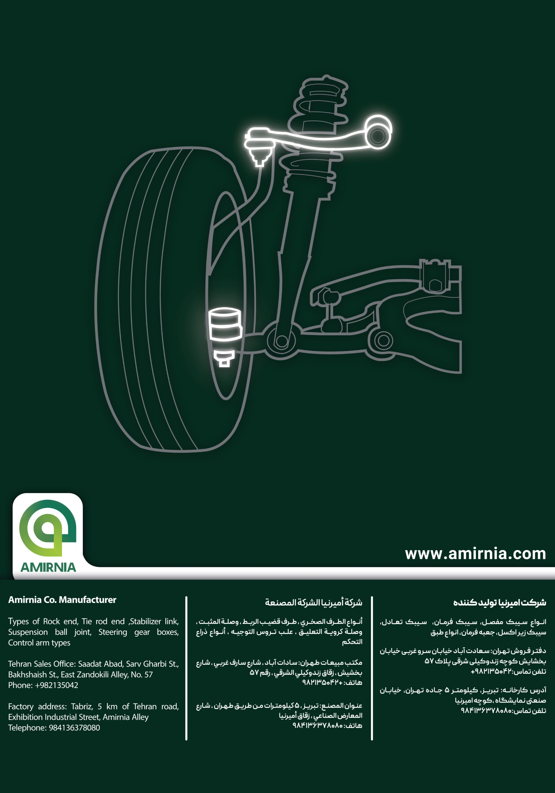 شرکت تولیدی صنعتی امیرنیا در سال 1369 با هدف والای کمک به ارتقاء صنعت ایران فعالیت خود را با طراحی، تولید و صادرات انواع قطعات سیستم تعلیق و فرمان خودروهای سواری درتبریز آغاز نموده است. گستره وسیع محصولات ،کیفیت بالا، قیمت مناسب به همراه مطالعات مشتری محور، امیرنیا را تولید کننده پیشرو قطعات یدکی خودرو در خاورمیانه نموده است.